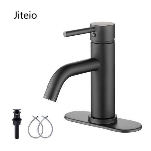 Jiteio Black One Hole Single Handle Bathroom Faucet RV Matte Black Bathroom Faucets Bathroom Vanity Faucet with Pop Up Drain with Overflow and Hose